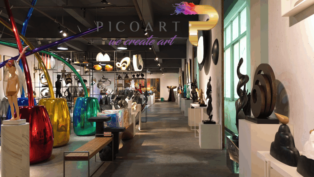 Pico Art’s exhibition hall showcases a diverse range of sculpture styles and forms, from abstract and animal-inspired pieces to unique, imaginative representations. Visitors can experience the wide variety of materials we employ, including iron, stainless steel, copper, composites, and transparent resin. These works reflect our versatility in both material and design, featuring large-scale installations, intricate ornaments, hanging décor, and wall-mounted artwork.