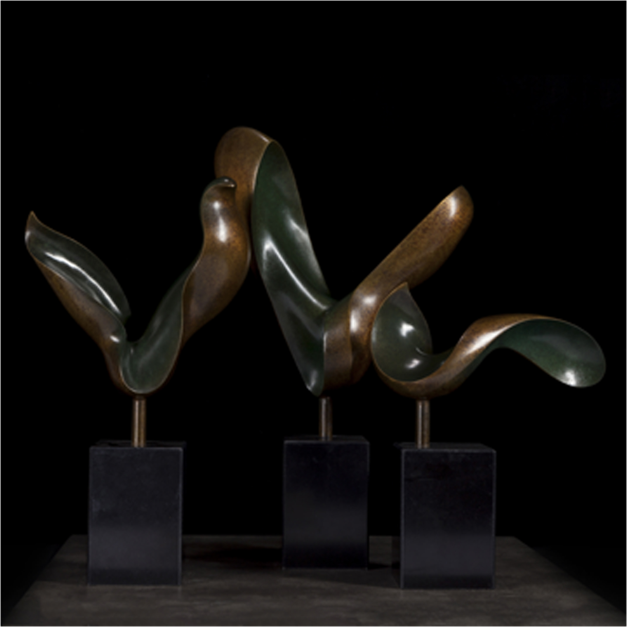 This three-piece bronze sculpture embodies the rhythm and vitality of dance through its flowing lines and undulating forms. The surface blends antique bronze tones with deep green hues, creating a rich interplay of colors reminiscent of leaves swaying in the wind or dancers poised in graceful motion. The minimalist pedestal grounds the composition, enhancing its visual impact. Infused with both the vitality of nature and the freedom of abstraction, this artwork is ideal for display in hotel lobbies, galleries, or contemporary interiors, where it conveys an atmosphere of movement and elegance.