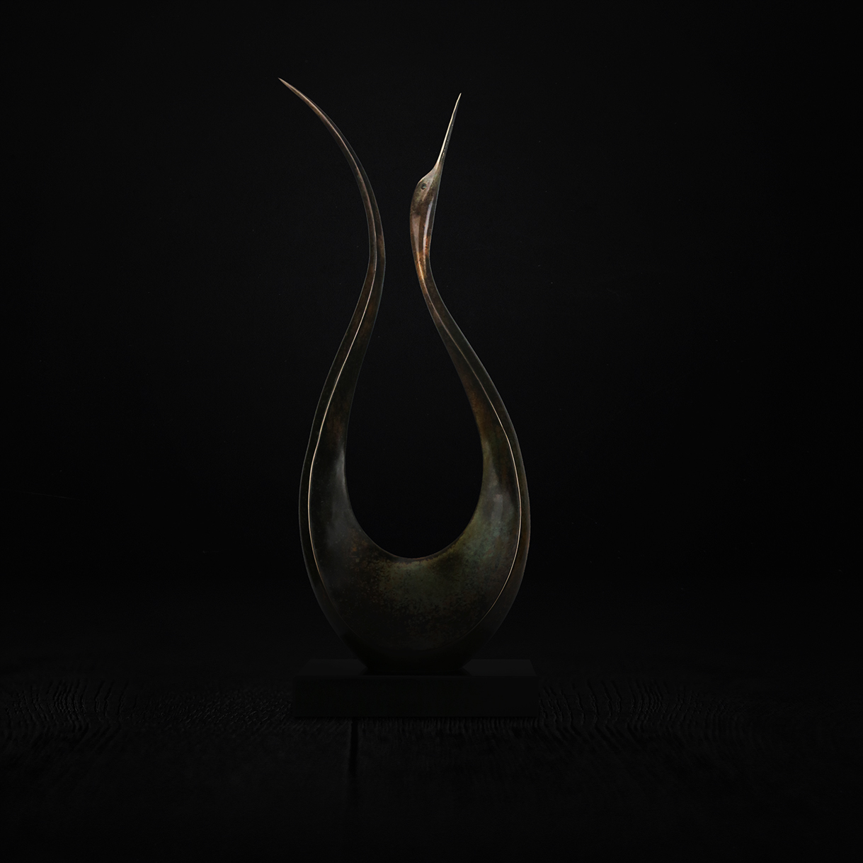 This bronze sculpture captures the elegant form of a crane, defined by minimalist flowing lines and a graceful upward pose. Its streamlined silhouette conveys both softness and strength, with the base gently narrowing and the top unfolding like a wing in motion. The patina finish, blending antique bronze with deep green hues, adds depth and contemporary refinement. As a timeless symbol of longevity, harmony, and elegance, the crane serves both as a striking centerpiece and as an emblem of serenity and strength in any space.