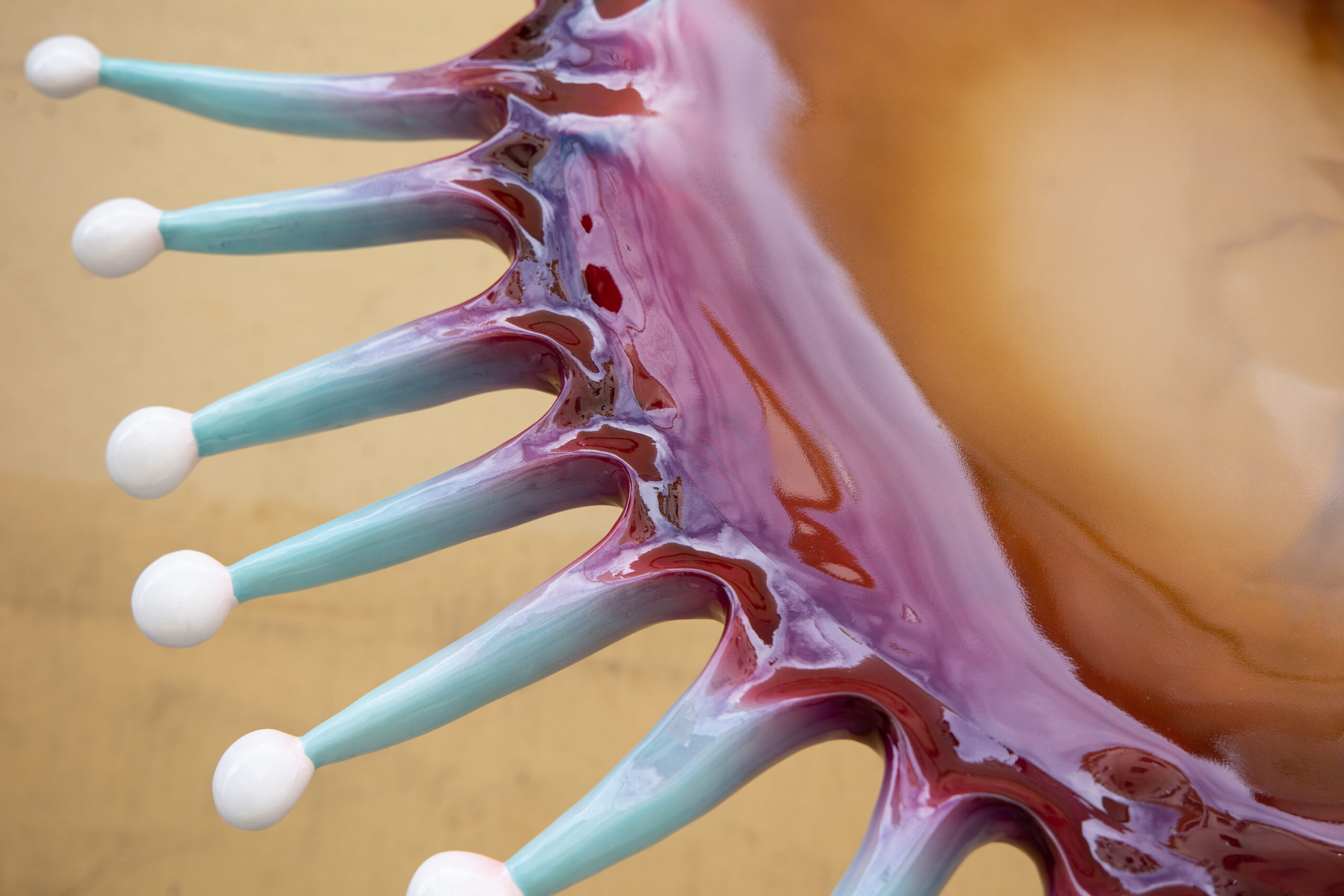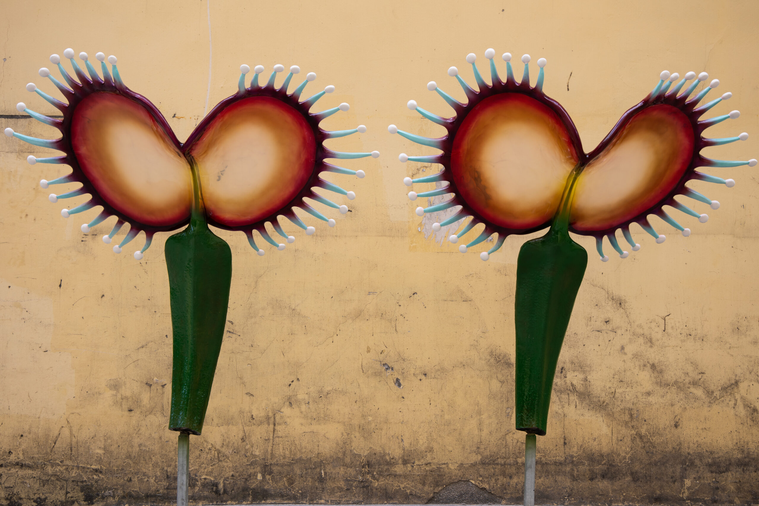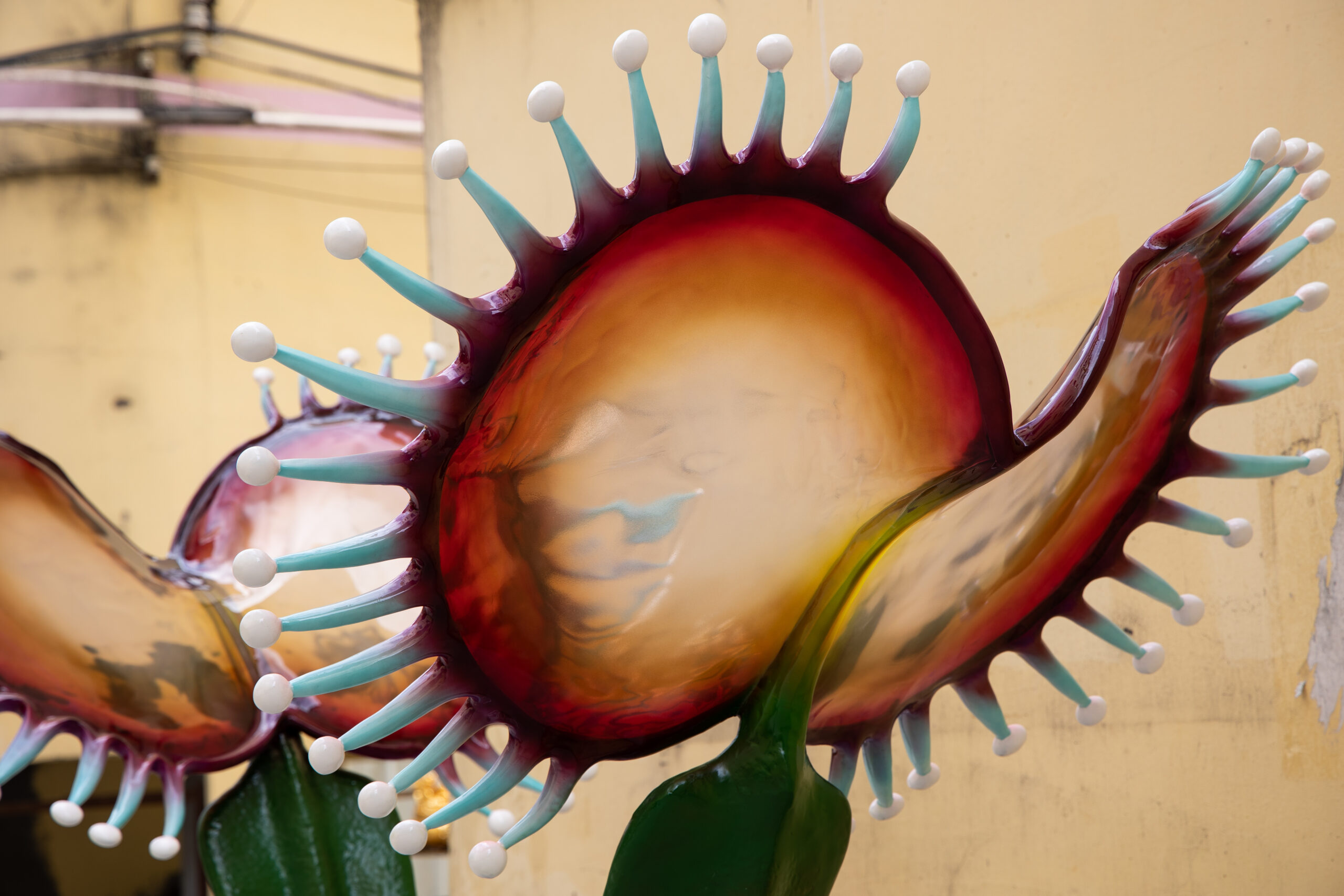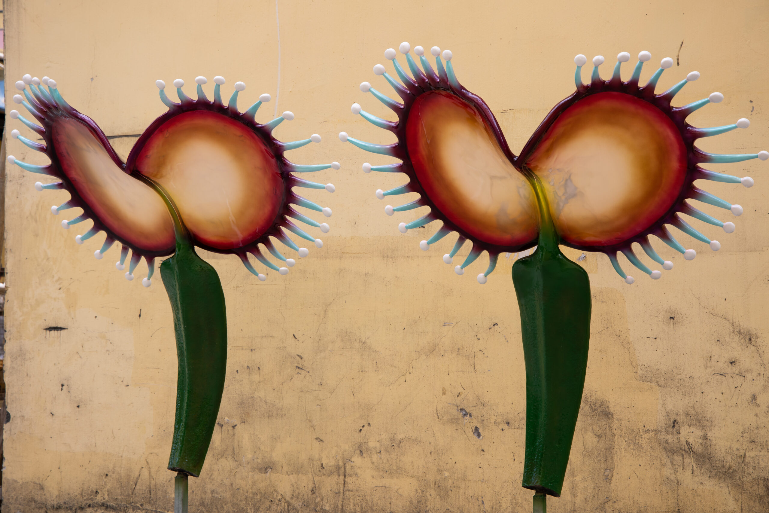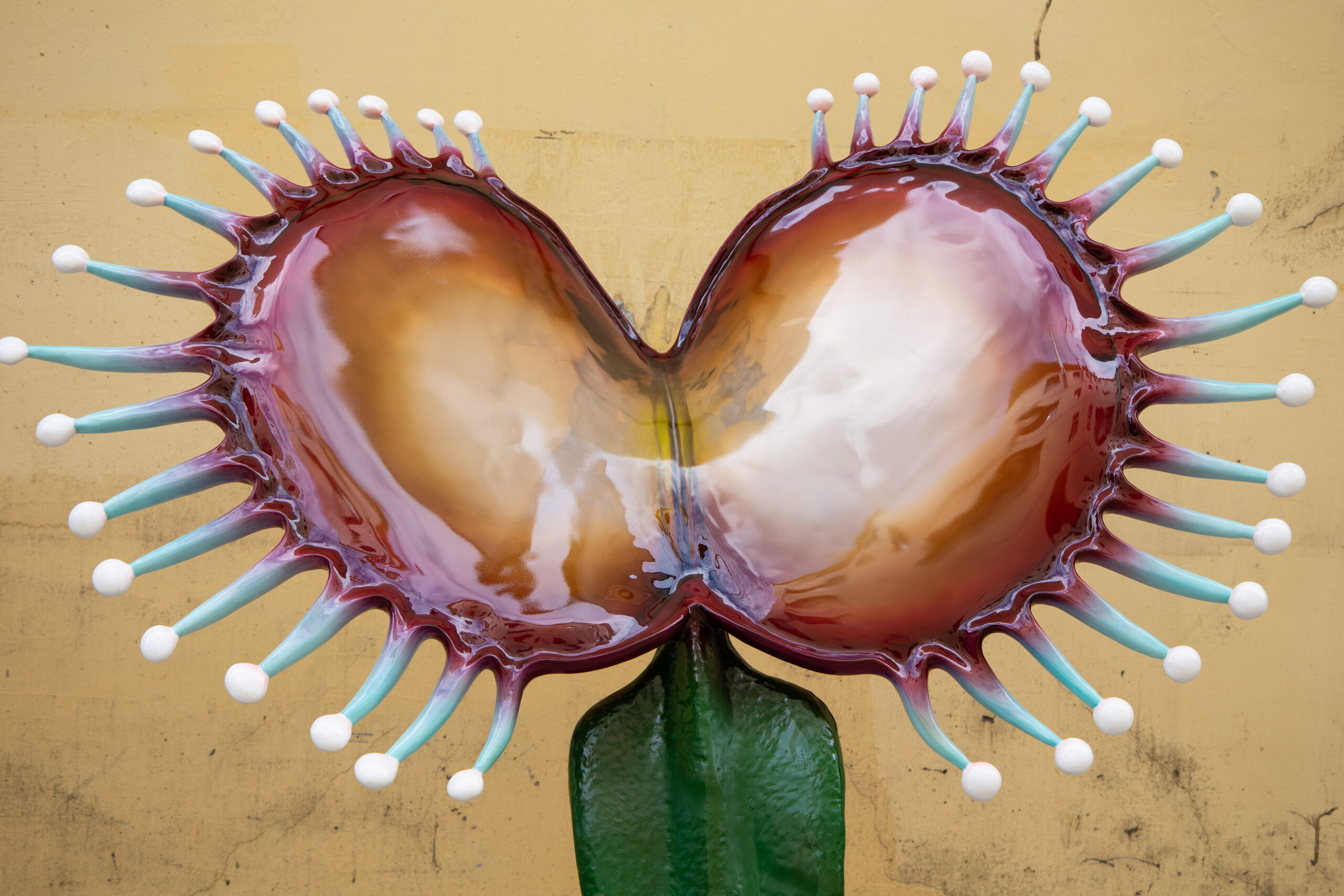 Dreamcatcher Bloom is a sculptural piece inspired by the Venus Flytrap, reimagined with exaggerated forms and translucent textures. The twin symmetrical blooms resemble radiant amber petals, with delicate extensions reaching outward as if sensing the unseen. This artwork embodies both the primal force of nature and the human fascination with mystery and imagination. As a striking art installation or landscape feature, it creates an atmosphere where dreams and futuristic visions intertwine.