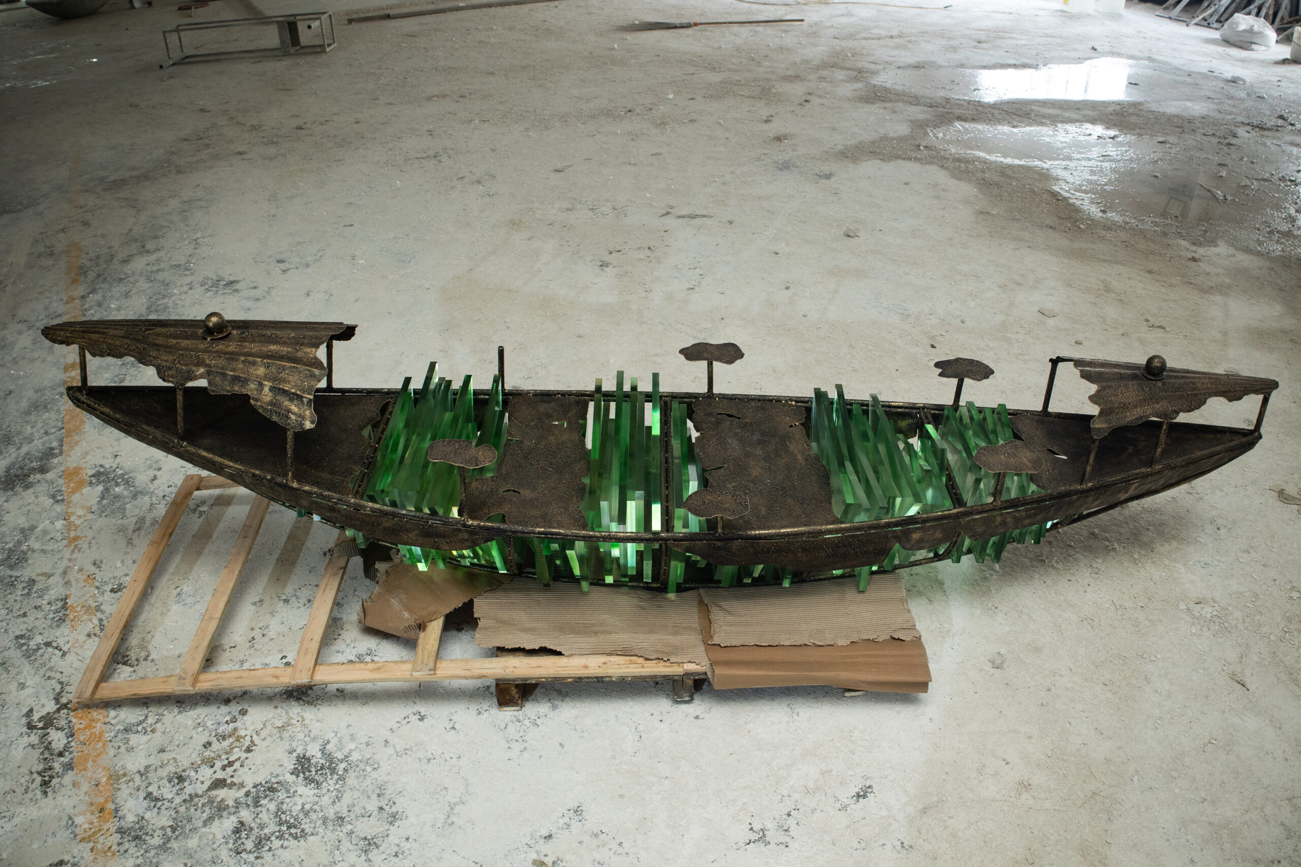 Emerald Shadow Boat is crafted with a rustic metal frame and layered green glass panels, evoking the imagery of rippling waters and shifting light. The design bridges the elegance of ancient Eastern boats with the clarity of modern materials, symbolizing a vessel that carries culture, memory, and dreams across time. As both a sculptural centerpiece and a poetic installation, it brings depth, history, and artistry to any environment, whether in a gallery, courtyard, or private collection.