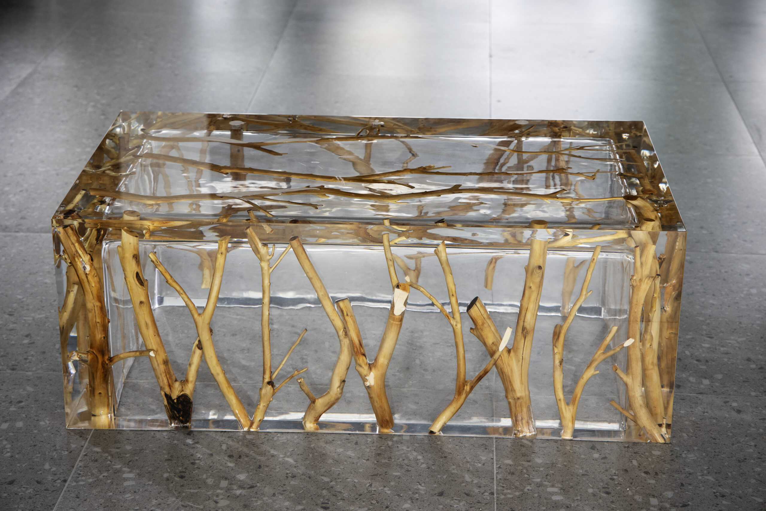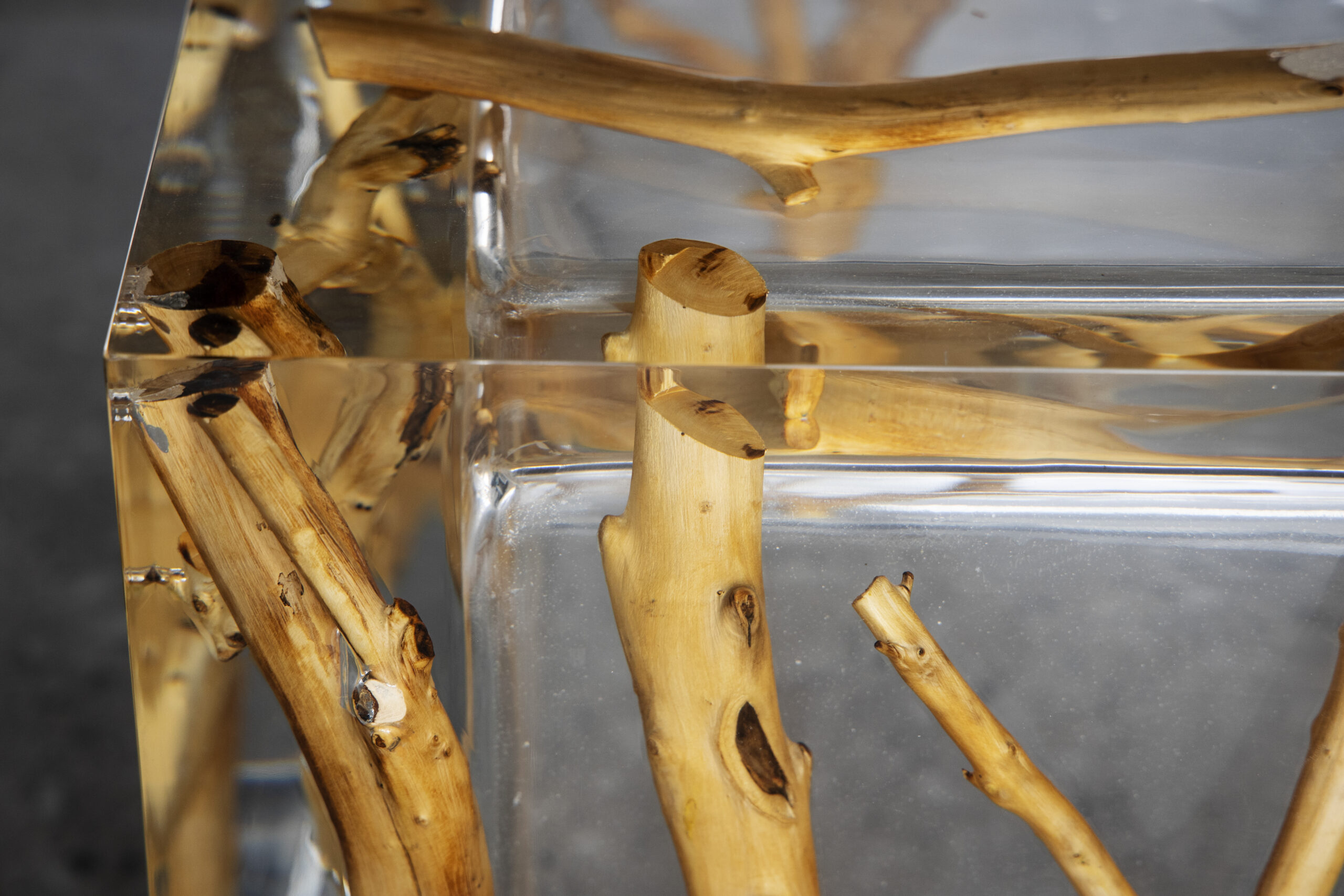 The Forest Shadow Resin Chair is crafted from high-transparency resin, encapsulating natural wooden branches within its clear structure. The clean, geometric form contrasts with the organic irregularity of the twigs, creating a unique blend of nature and contemporary design. Functional yet artistic, this chair serves as both seating and a striking statement piece, perfect for modern homes, galleries, and luxury lounges.