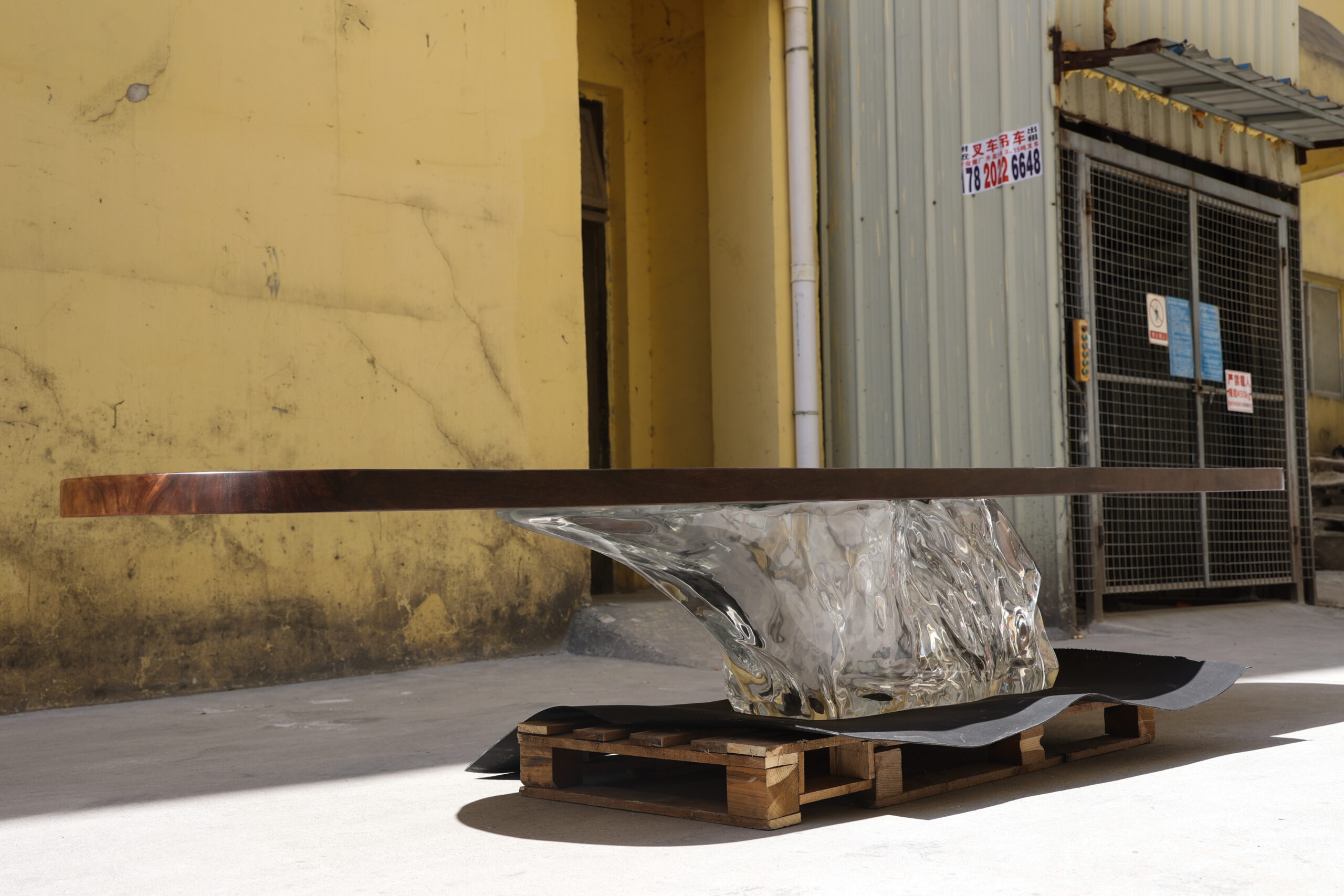 The Glacier Rock Resin Table combines natural wood with a crystal-clear resin base, where the solid wooden top contrasts beautifully with the glacial, rock-like resin support. It symbolizes the dialogue between earth and ice — warmth and solidity paired with light and translucence. Functional yet sculptural, this table is an artistic statement, ideal for luxury clubs, lobbies, and private residences.