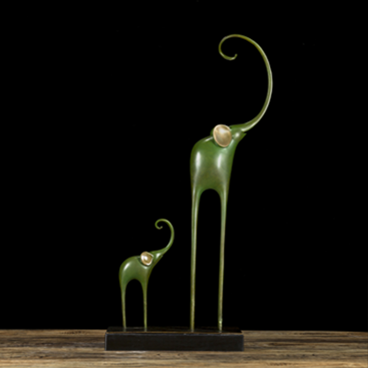 This bronze sculpture of two elephants embodies the warmth of companionship through minimalist, elongated forms. The larger elephant raises its trunk high, symbolizing strength and prosperity, while the smaller one stands close, representing family bonds and protection. Finished with a smooth green patina and accented with golden ears, the piece conveys a modern yet timeless charm. Beyond its auspicious symbolism, the theme of “guardianship and togetherness” resonates deeply, making it an ideal decorative artwork for homes, hotels, or offices—infusing spaces with both elegance and warmth.