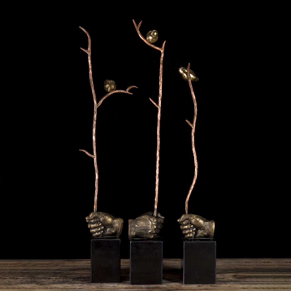 This three-piece bronze sculpture set combines hands, branches, and golden birds to convey themes of protection, hope, and renewal. The hands, firmly gripping the base of the branches, symbolize strength and guardianship, while the slender branches reaching upward represent vitality and growth. The golden birds perched upon them add a touch of liveliness and warmth, highlighting the harmony between humanity and nature. With its minimal yet profound design, the piece is ideal for galleries, hotel lobbies, or cultural spaces, where it evokes reflections on coexistence and the cycle of life.