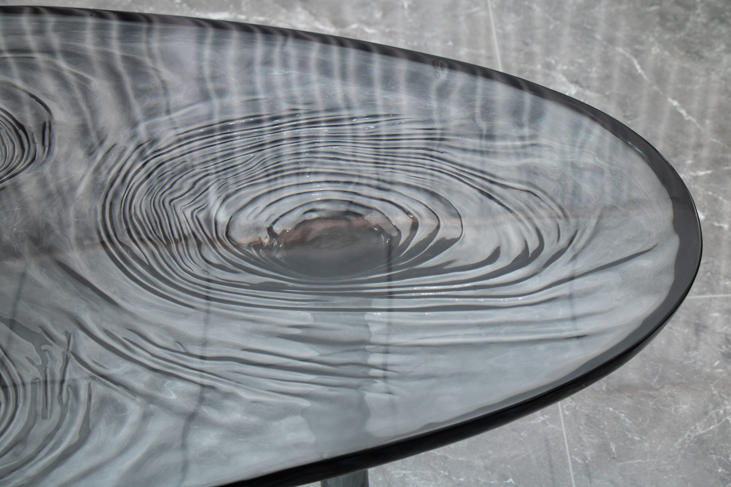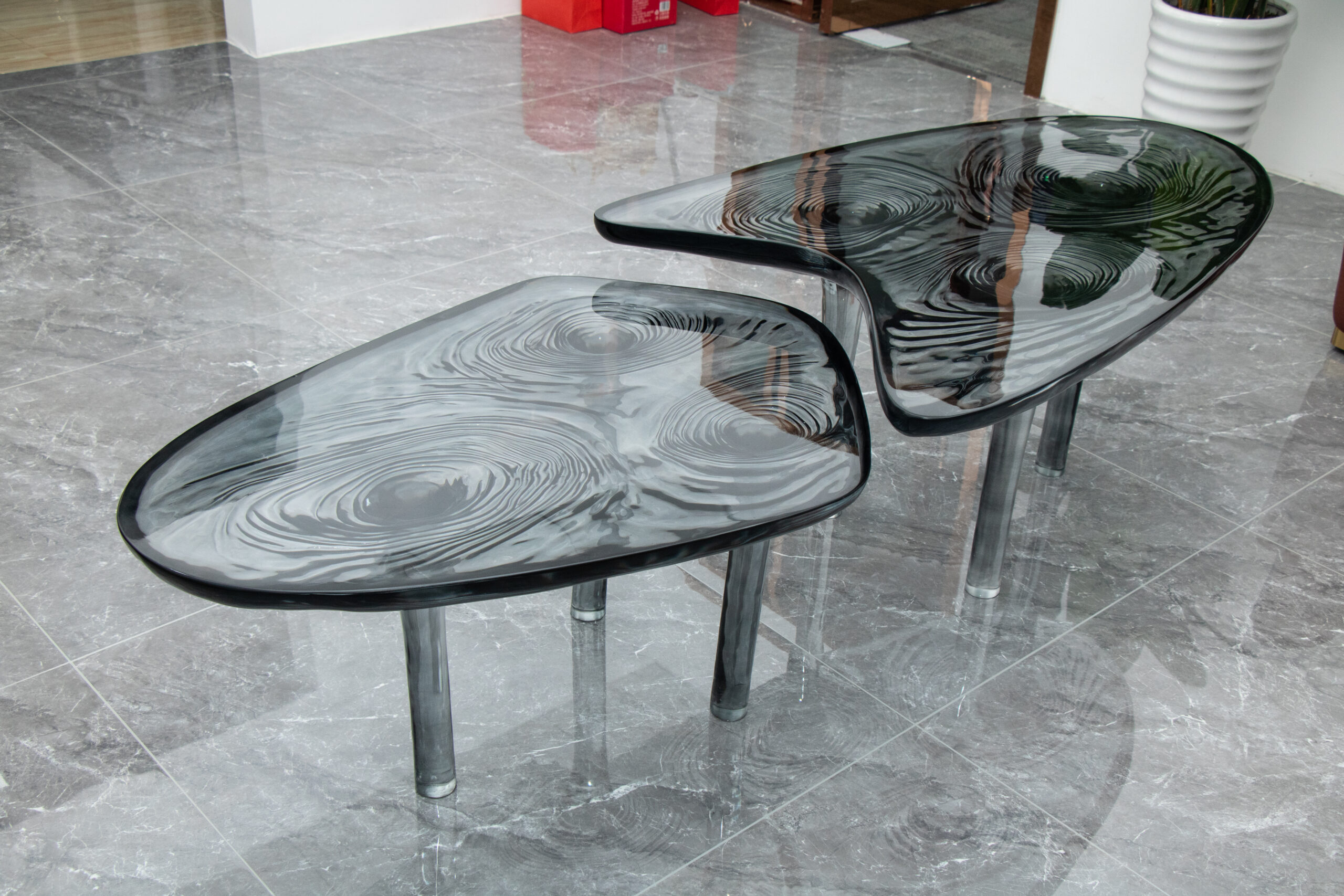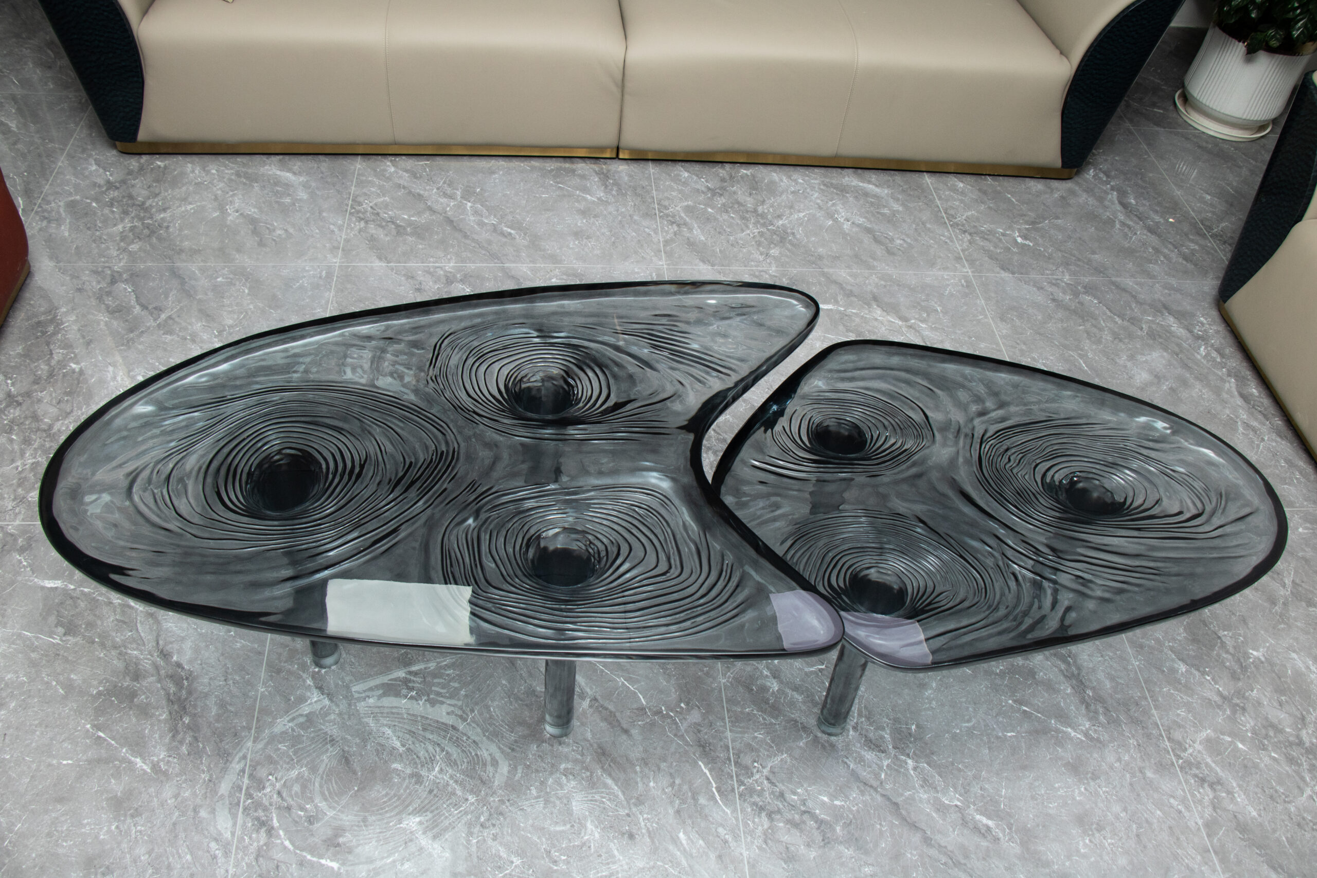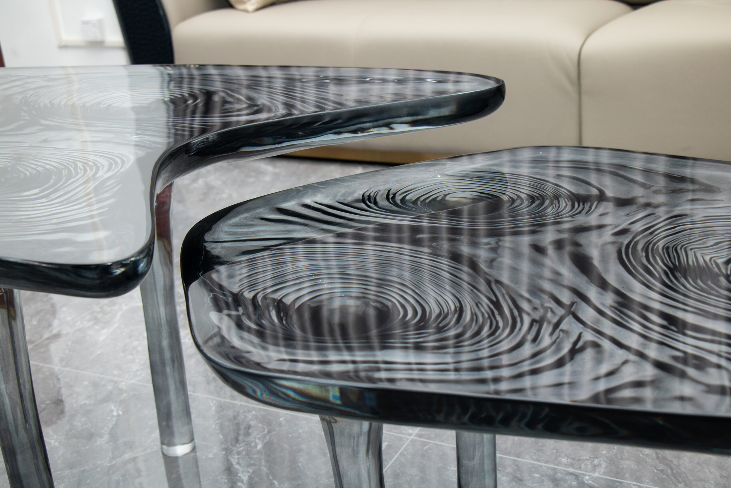 The Ink Ripple Table captures the poetic beauty of ripples frozen in time. Its surface features layered ripple textures, reminiscent of water disturbed by a single drop. The dual irregular tabletops paired with clear legs create a dynamic yet airy presence, balancing solidity with transparency. The ink-like black gradients add a sense of depth and elegance, merging Eastern artistic charm with contemporary design. Ideal for art galleries, hotel lobbies, or private living spaces, it serves as a stunning centerpiece that sparks conversation.