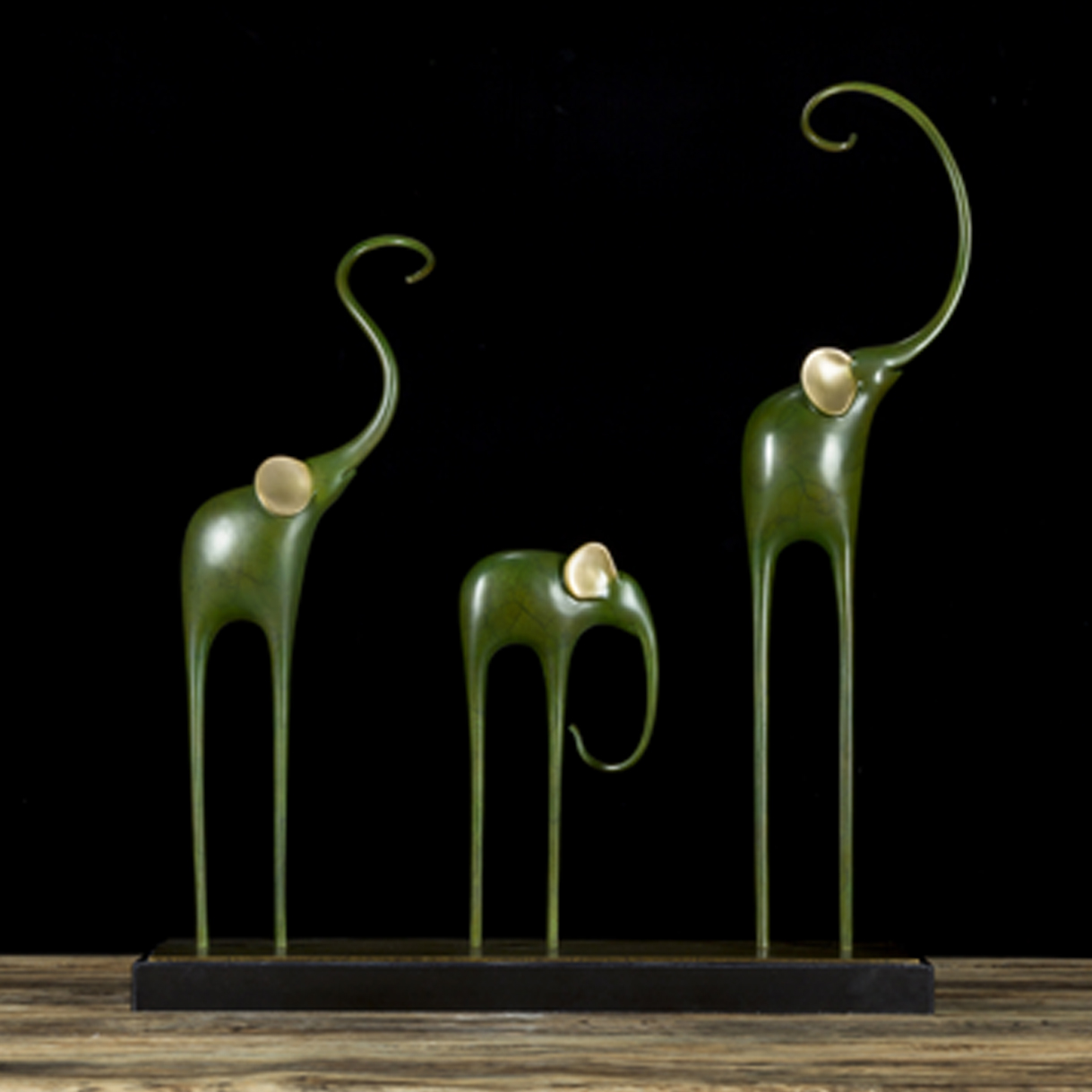 This three-piece bronze sculpture portrays elephants in graceful minimalist forms, finished with a smooth green patina and highlighted by golden ear details. Each elephant expresses a different posture—raising the trunk, bowing the head, or curling the nose—capturing a sense of intimacy and interaction. Symbolizing family, unity, and protection, the set conveys warmth and blessings. Perfect as a contemporary decorative piece, it enriches any environment with elegance while carrying auspicious meaning.
