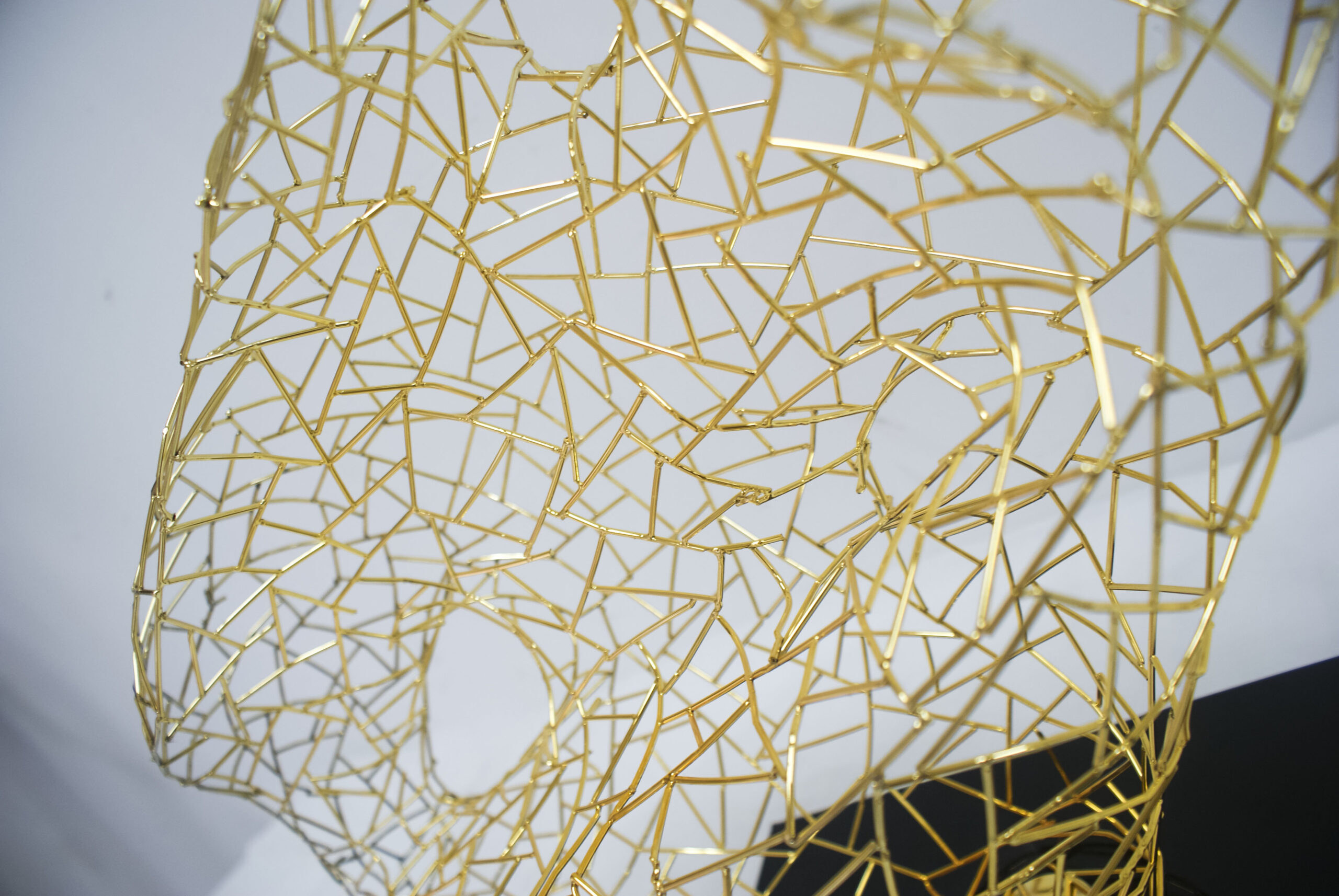 This sculpture is composed of interwoven metallic lines, creating a lightweight and transparent openwork structure. The golden framework forms a geometric web-like pattern, resembling light and shadow captured in solid form. Its free-flowing design symbolizes connection and infinite possibilities. Resting on a sleek black base, the piece harmonizes seamlessly with contemporary interiors. Perfect as a centerpiece in hotel lobbies, art galleries, or luxury residences, it brings a distinctive artistic character and a modern sense of elegance to any environment.
