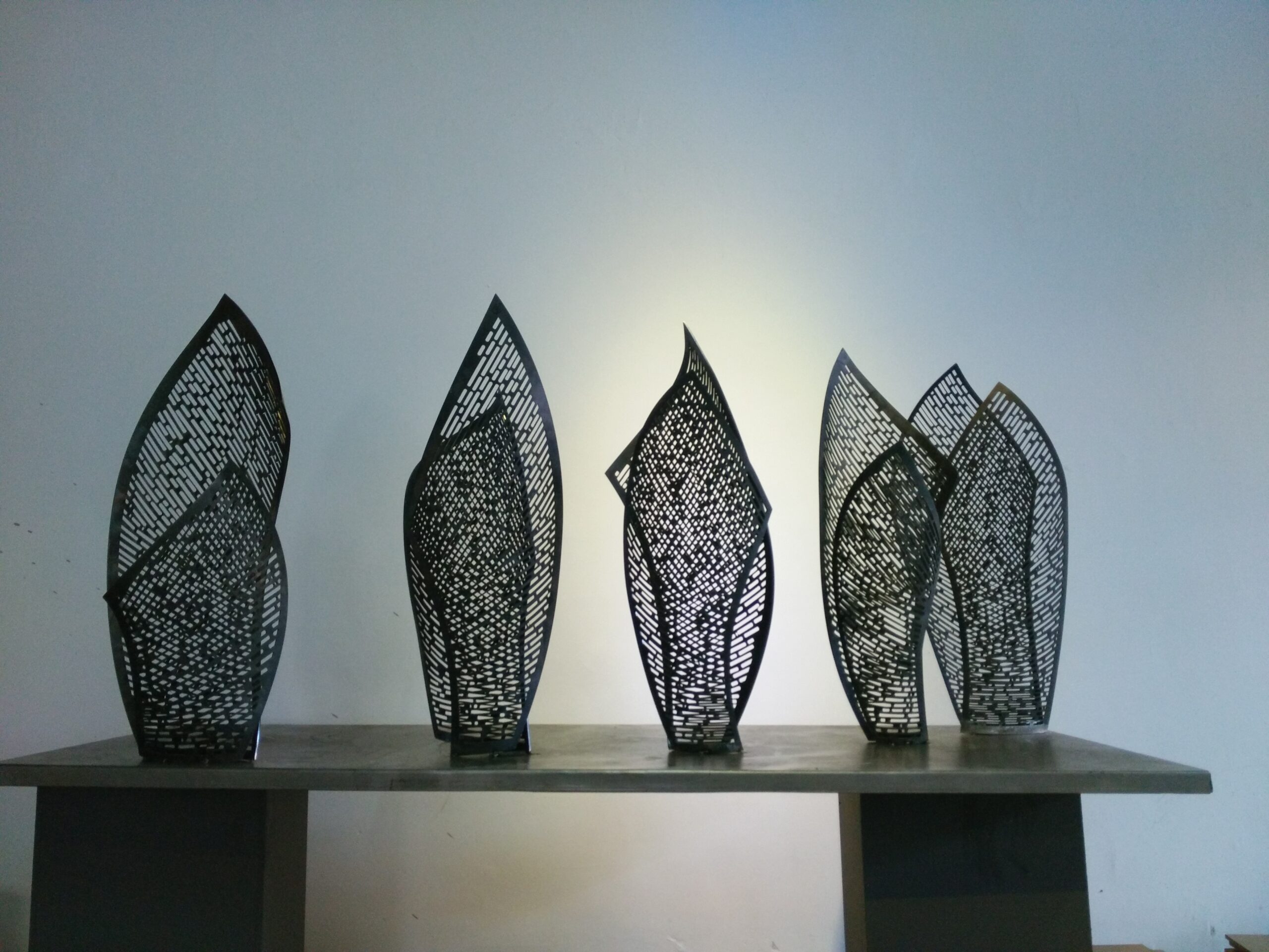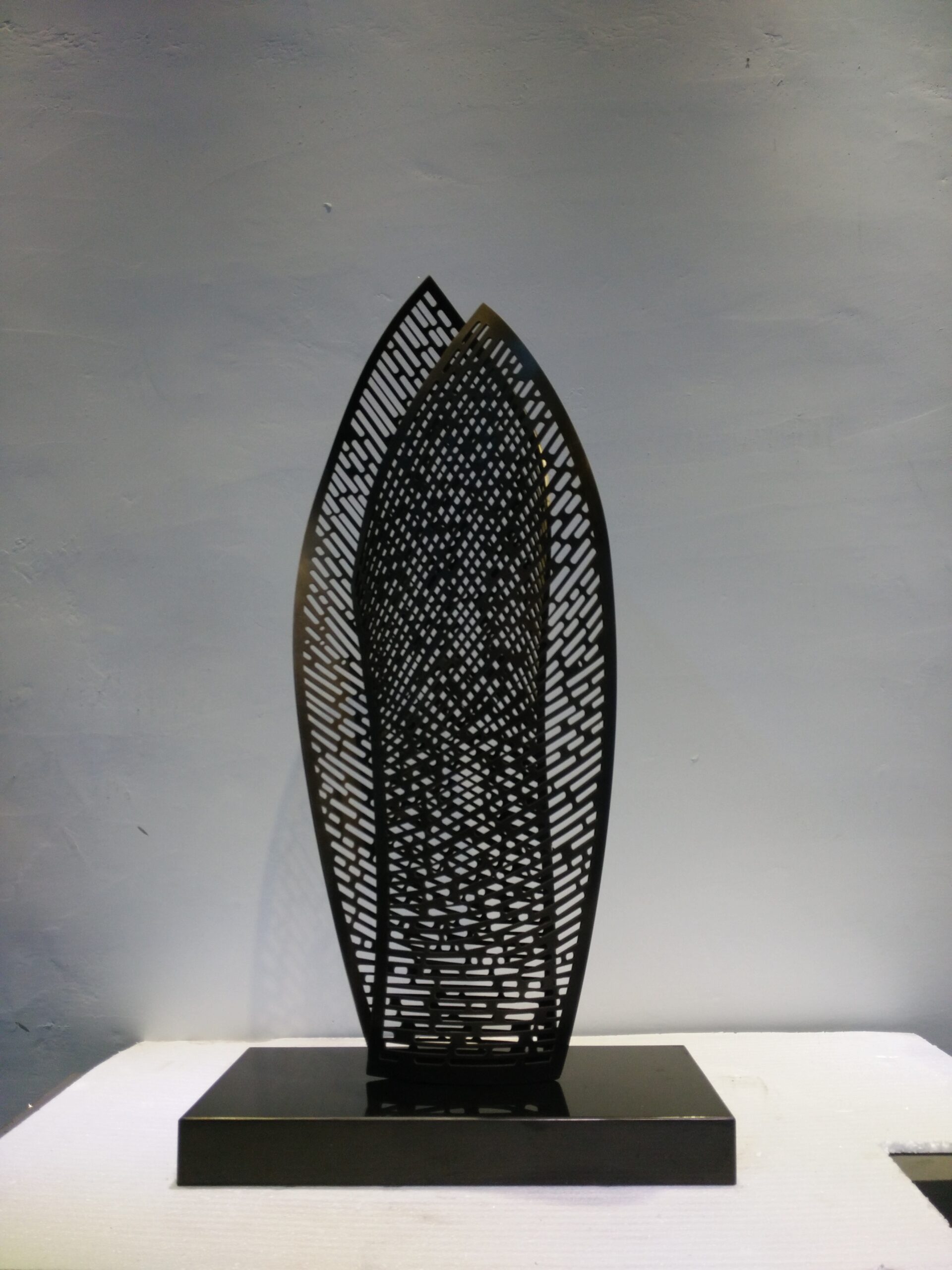 This collection of sculptures is crafted with intricate metal hollowing techniques, inspired by the organic form of leaves. Each piece features meticulously cut patterns that resemble the delicate textures of foliage, evoking the imagery of leaves whispering in the wind. The arrangement creates a dynamic sense of rhythm and spatial depth, combining lightness with contemporary elegance. Symbolizing the harmony of nature and art, the set is ideal for hotel lobbies, art galleries, landscape designs, and luxury residences, bringing vitality and refinement to any environment.