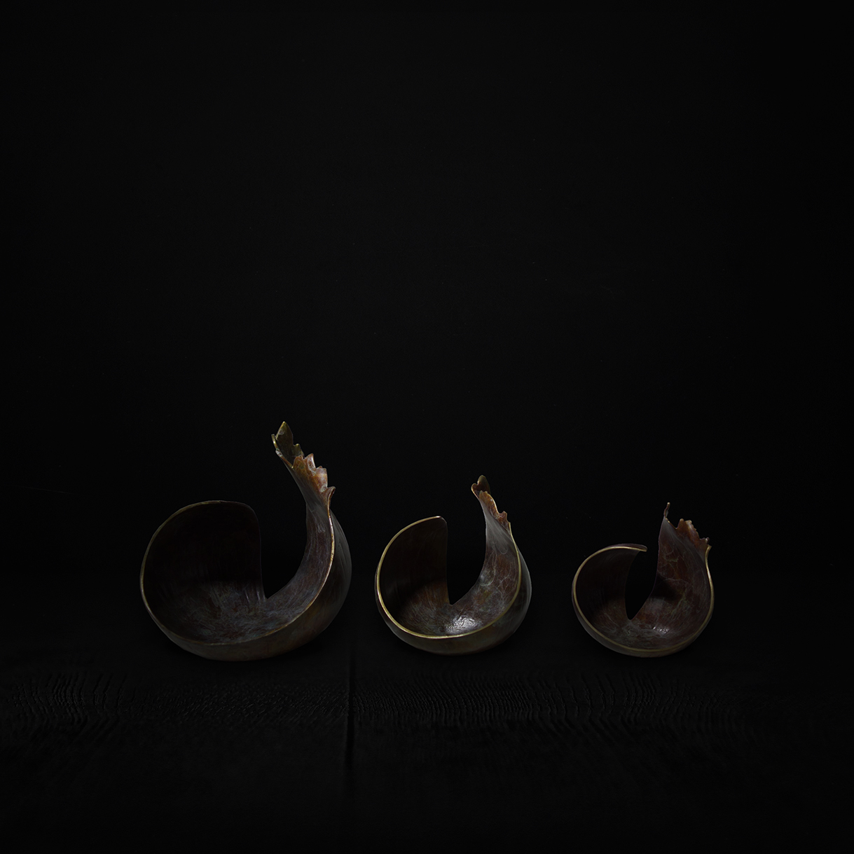 This three-piece bronze sculpture set captures the rhythm and vitality of surging waves through its spiral forms. Resembling the fleeting moment of cresting water, the curves are fluid and dynamic, while the jagged edges enhance a sense of motion and energy. The bronze surface, polished and treated with traditional techniques, exudes a profound yet refined texture. When displayed together, the pieces create an engaging dialogue of resonance and flow; individually, each stands as a distinctive statement, adding depth and artistic atmosphere to any space.