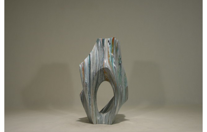 Rock of Time draws inspiration from geological strata and eroded caves, with its central hollow form and vertical textures reflecting the eternal forces of nature. The colorful veins resemble mineral flows, as if solidifying millions of years of geological transformation. The sculpture stands as both a symbol of nature’s strength and a gateway into the depths of time.