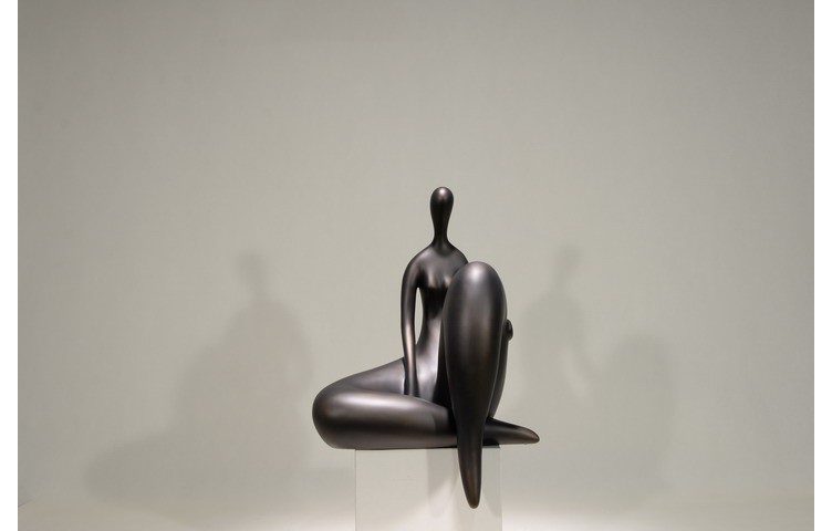 Silent Contemplation portrays an abstract female figure in a semi-reclining seated posture, embodying both relaxation and inner peace. The elongated, fluid form radiates silent thoughtfulness, while the smooth dark metallic finish adds a contemporary aura, symbolizing harmony and quiet strength.
