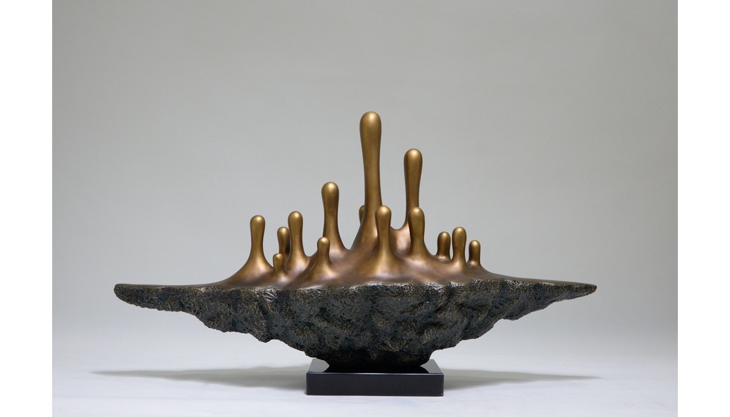 This sculpture emerges from a rugged rock base, with golden organic forms rising as if capturing the heartbeat of the earth in a single moment. It resembles both surging magma and the outburst of life energy from deep within the planet. By contrasting raw texture with refined fluidity, and solidity with upward motion, the work embodies the eternal power and creativity of nature. Its expressive, rhythmic form evokes the breath of the earth and the pulse of the cosmos, making it a striking centerpiece for modern interiors, galleries, or public spaces.