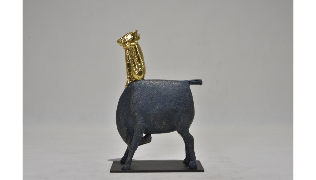 The Meditative Rider juxtaposes the raw, textured body of an animal with a gleaming golden figure perched quietly on its back. The contrast embodies both weight and lightness, grounding and transcendence. It symbolizes the dialogue between humanity and nature, as well as the contemplative journey within. With its striking interplay of texture and color, the piece exudes both modern elegance and timeless depth.