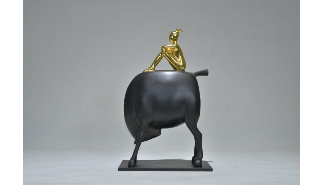 Thought & Reliance embodies humanity’s profound dependence on nature. The rounded black bull symbolizes the earth’s strength and generosity, while the golden figure perched on its back conveys contemplation and humility. The contrast of mass and delicacy, darkness and brilliance, highlights the balance between humanity and nature. Minimalist yet deeply philosophical, this piece radiates a powerful sense of contemporary art.